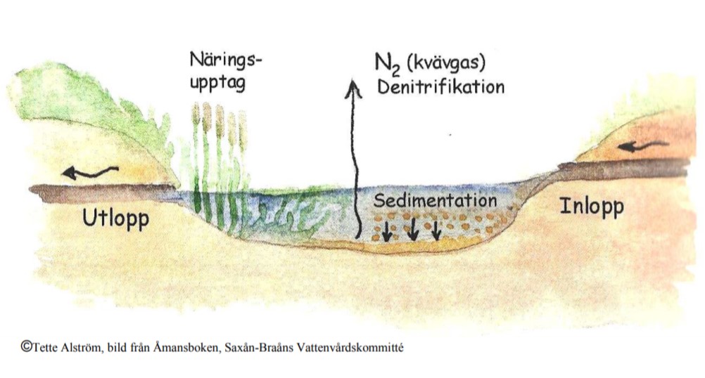 Våtmarker renas från näring i en damm genom sedimentation, upptag av växter och denitrifikation. Vad är denitrifikation?